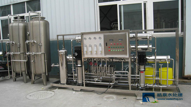 原水-原水加壓泵-多介質(zhì)過濾器-活性炭過濾器-軟水器(或阻垢加藥裝置)-精密過濾器-第一級反滲透-PH調(diào)節(jié)-中間水箱(可選)-第二級反滲透(反滲透膜表面帶正電荷)-純化水箱-純水泵-紫外線殺菌器-微孔過濾器-用水點
